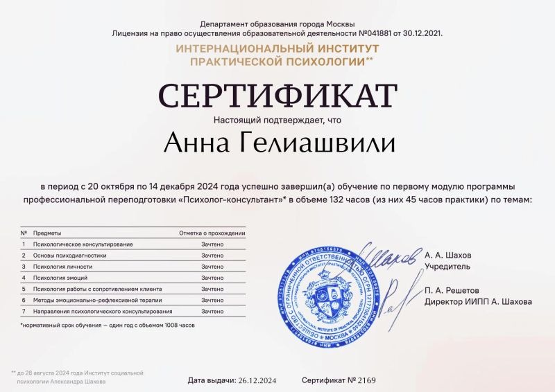 - Интернациональный институт практической психологии, программа «Психолог-консультант», 2024 г.