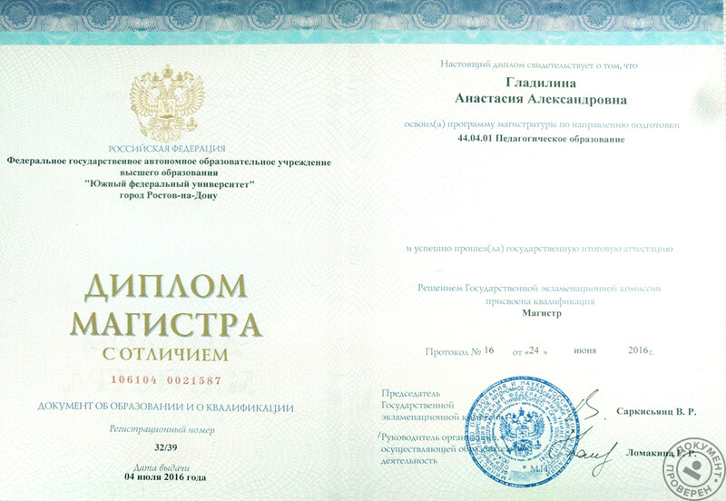 - ЮФУ, магистр педагогического образования, диплом с отличием (2016 г.).
