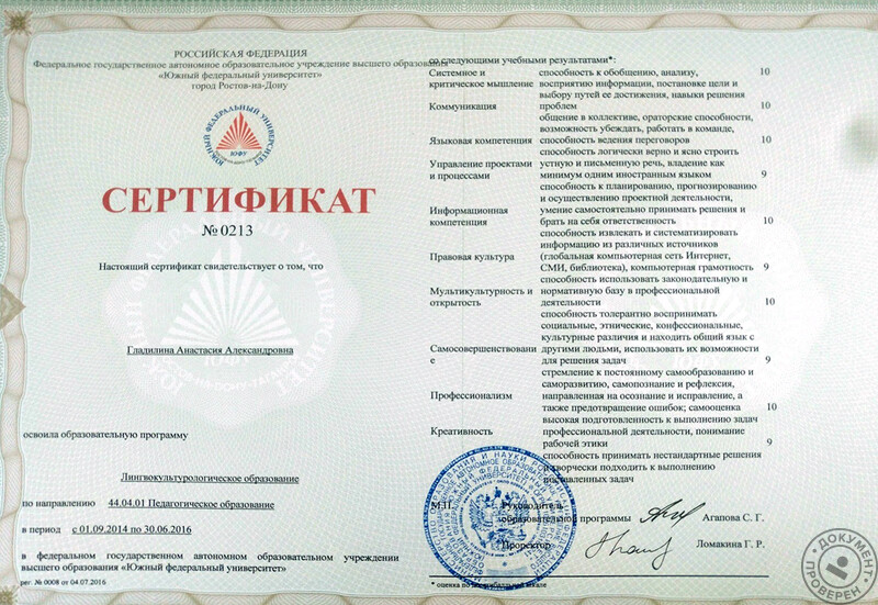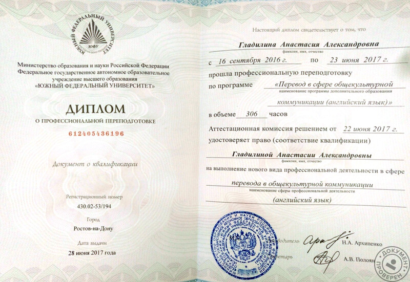 - Прошла профессиональную переподготовку по программе «Перевод в сфере общекультурной коммуникации (английский язык)», ЮФУ (2017 г.).