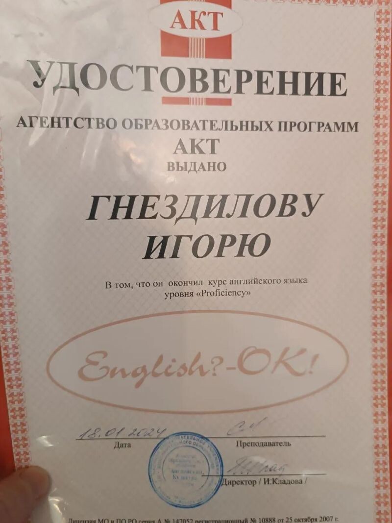 - Сертификат о прохождении курса английского языка уровня " Proficiency " (с 2024 г.).