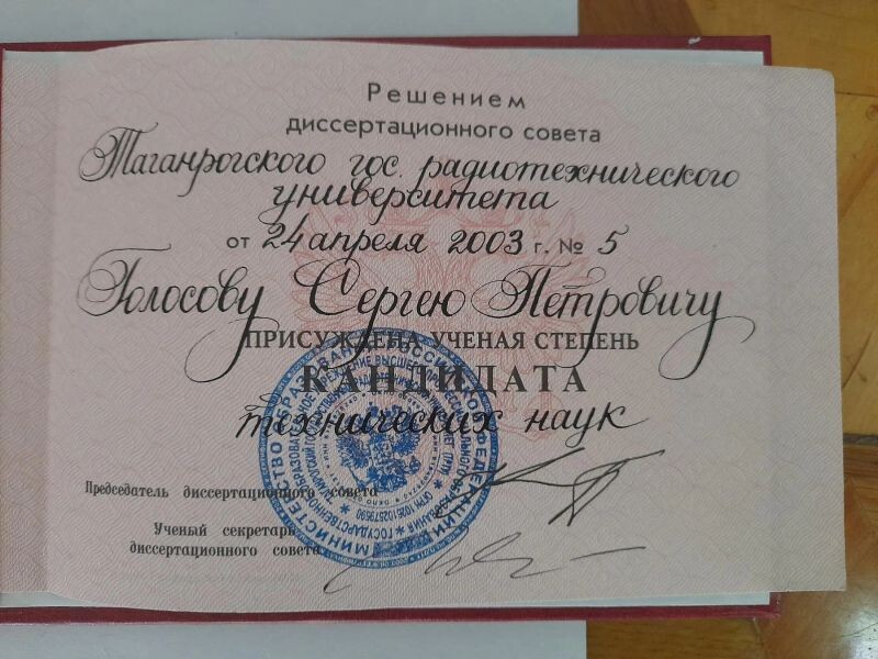 - Таганрогский государственный радиотехнический университет, кандидат технических наук, 2003 г.