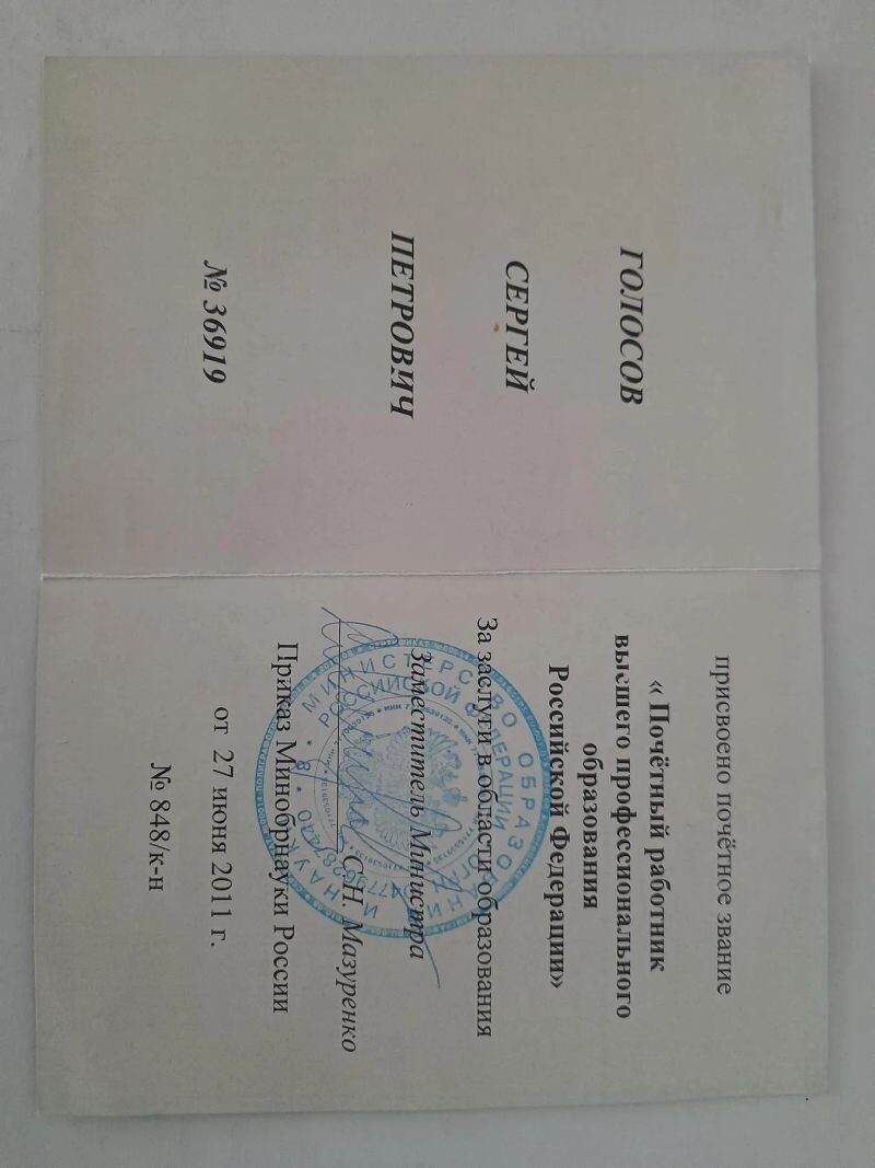 - Минобрнауки России, присвоено звание «Почётный работник высшего профессионального образования Российской Федерации», 2011 г.