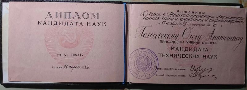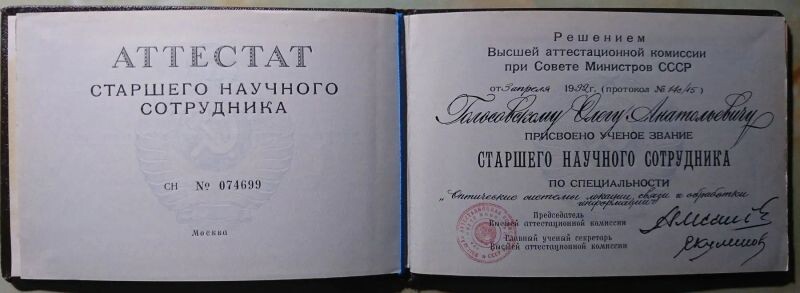 - Аттестат Старшего научного сотрудника, 1987–1992 гг.