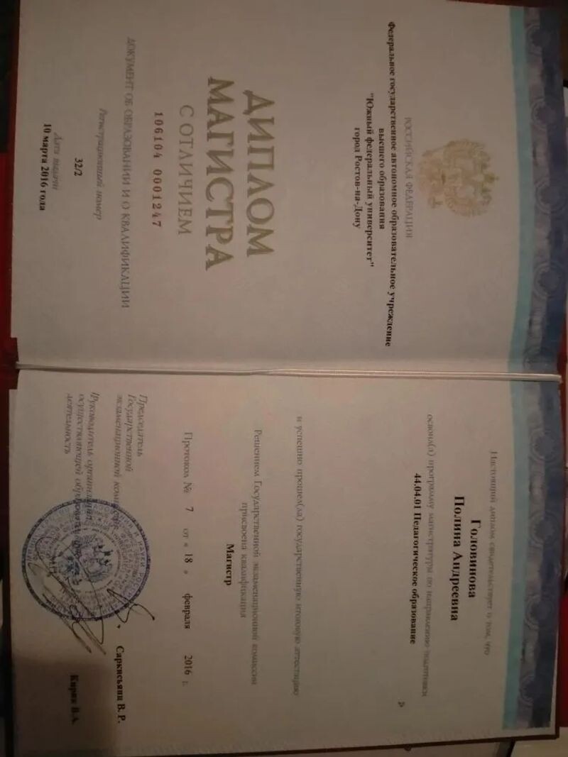 - Южный федеральный университет, направление: педагогическое образование, 2013–2016 гг.