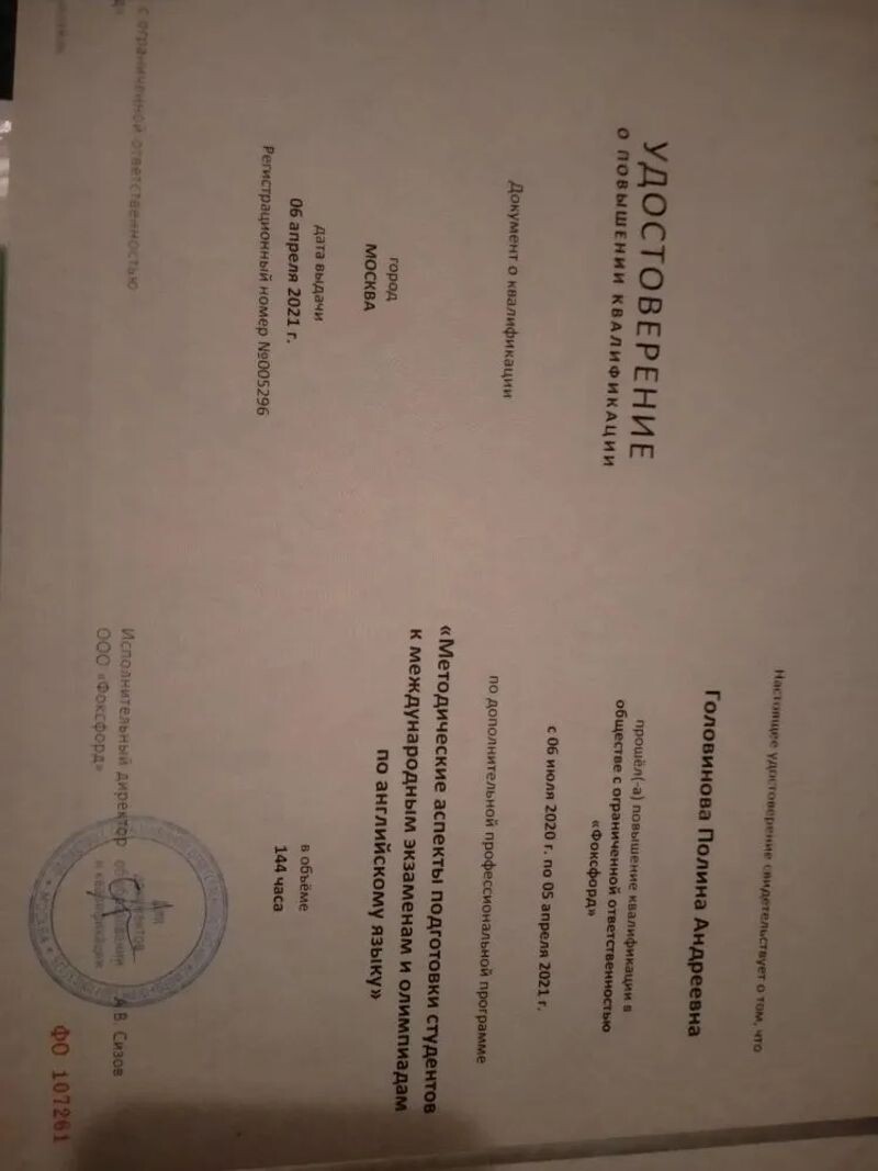 - ООО «Фоксфорд», программа: Методические аспекты подготовки студентов к международным экзаменам и олимпиадам по английскому языку, 2020–2021 гг.