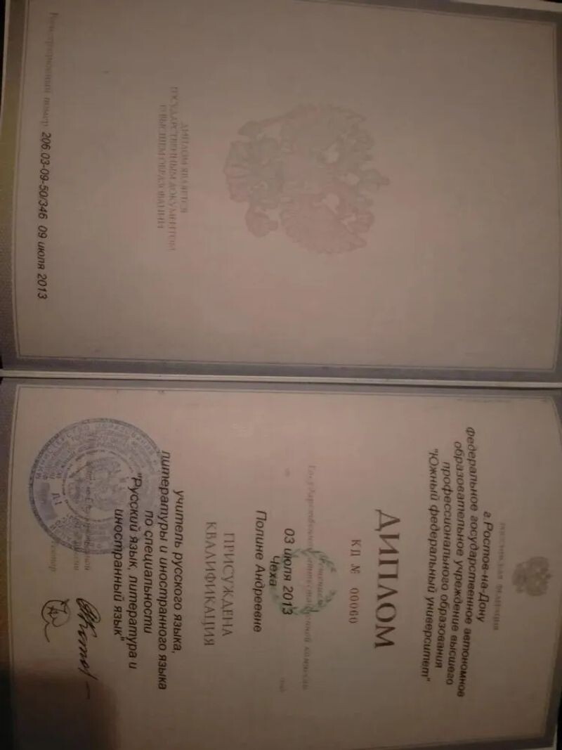 - Южный федеральный университет, учитель русского языка, литературы и иностранного языка, 2008–2013 гг.