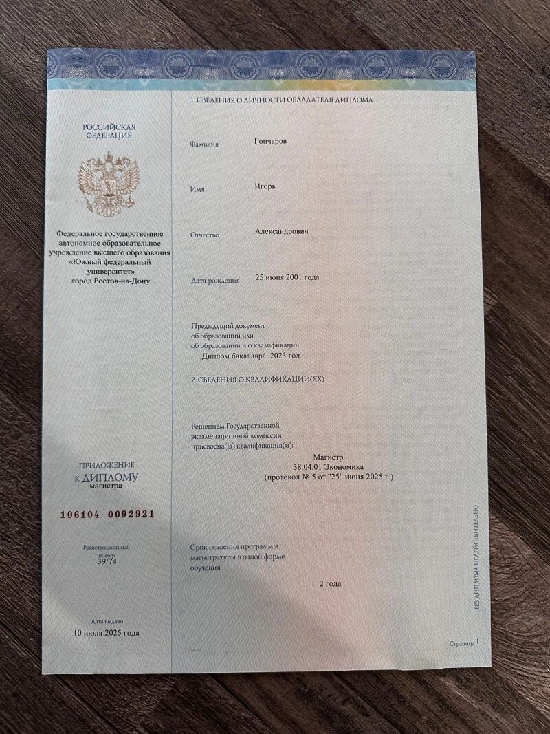 - Южный Федеральный Университет, Магистратура «Государственные и муниципальные закупки», очная форма, 2023–2025 гг.