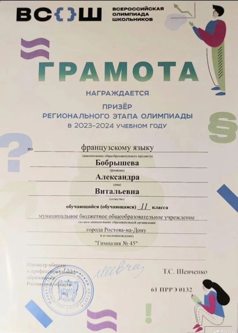 - Призёр регионального этапа ВСОШ по французскому языку (с 2024 г.).