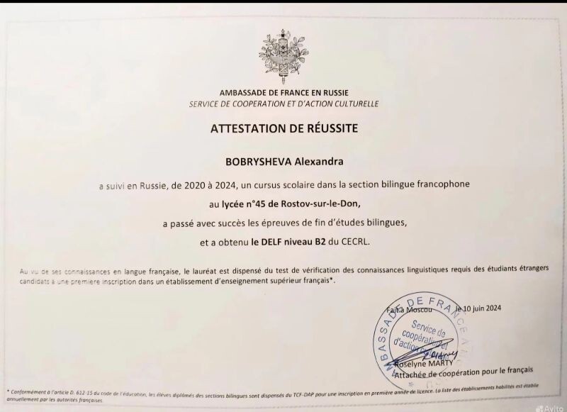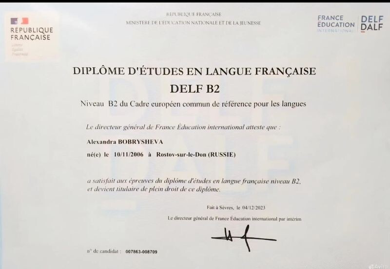 - Диплом DELF B2 (с 2024 г.).
