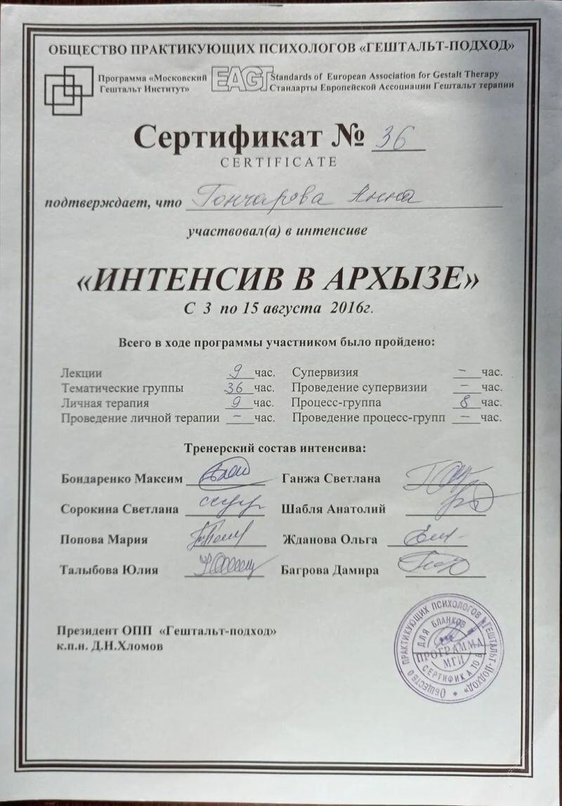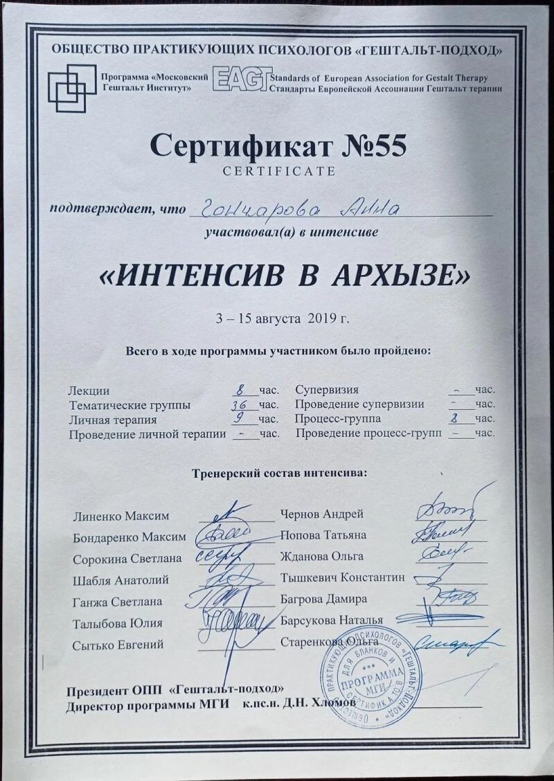 - Московский Гештальт Институт, психотерапевт в гештальт-подходе (с 2020 г.).