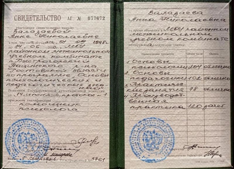 - МОУ районный межшкольный комбинат, основы педагогических и психологических знаний, помощник психолога, 1998–2000 гг.