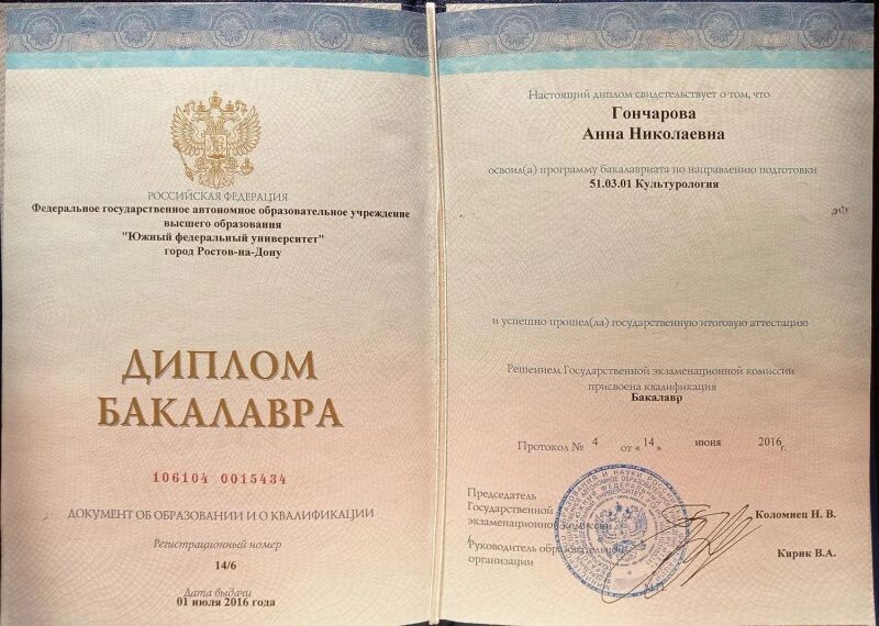 - Южнороссийский федеральный университет, культурология, 2010–2016 гг.