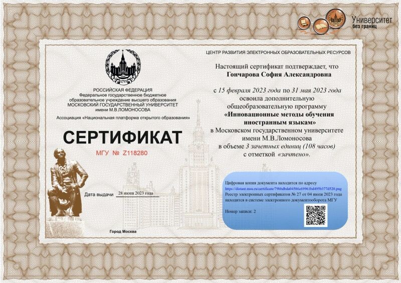 - Сертификат об освоении программы «Инновационные методы обучения иностранным языкам», Московский Государственный Университет имени М. В. Ломоносова (с 2023 г.).