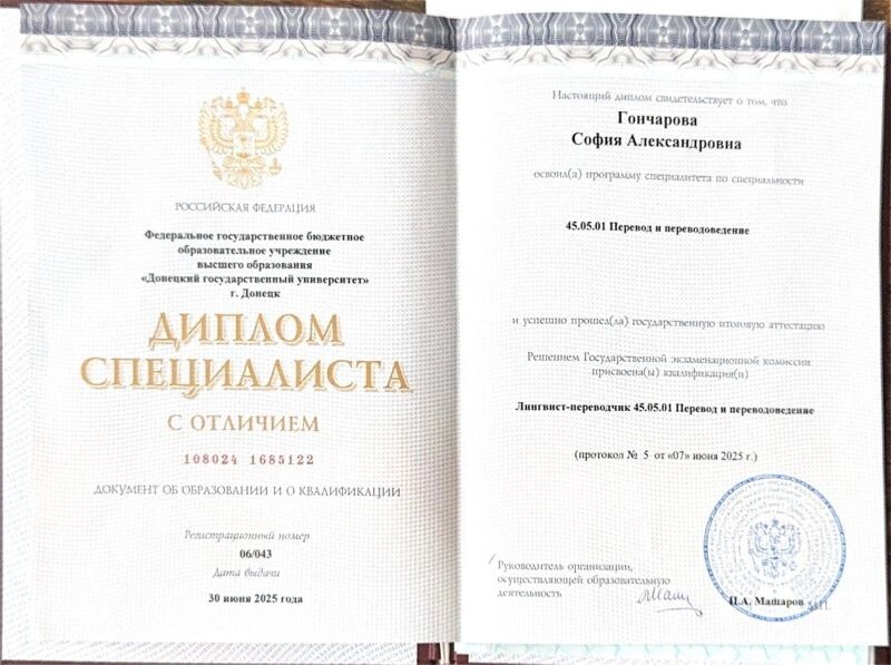 - Федеральное государственное бюджетное образовательное учреждение «ДонГУ», факультет иностранных языков, перевод и переводоведение (английский и немецкий языки), лингвист-переводчик, 2020–2025 гг.