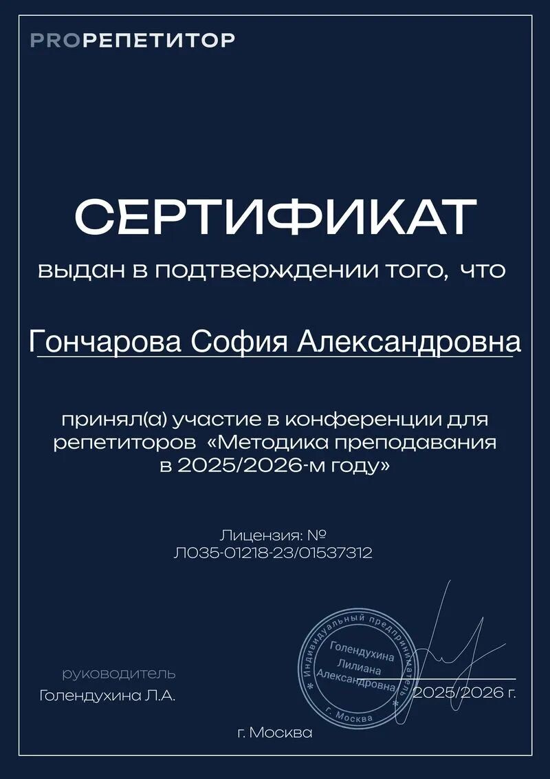 ► Связаться с Гончаровой Софией Александровной можно за пару минут. Нажмите на кнопку «Связаться с репетитором» и заполните короткую форму.