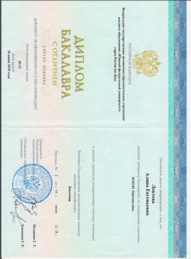 - Южный федеральный университет, бакалавр лингвистики, 2014–2018 гг.