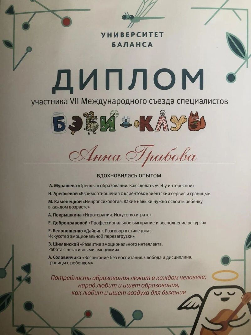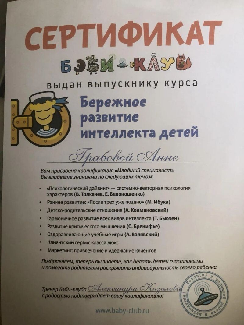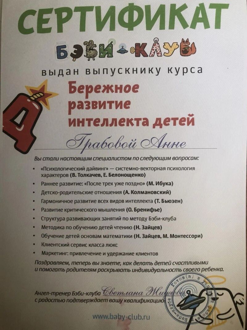 - ООО «Бэби-Клуб», курс «Бережное развитие интеллекта детей», 2018–2019 гг.