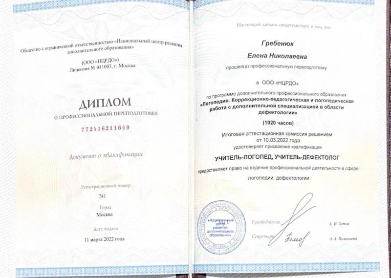 - ООО «НЦРДО», квалификация «учитель-логопед, учитель-дефектолог», 2021–2022 гг.