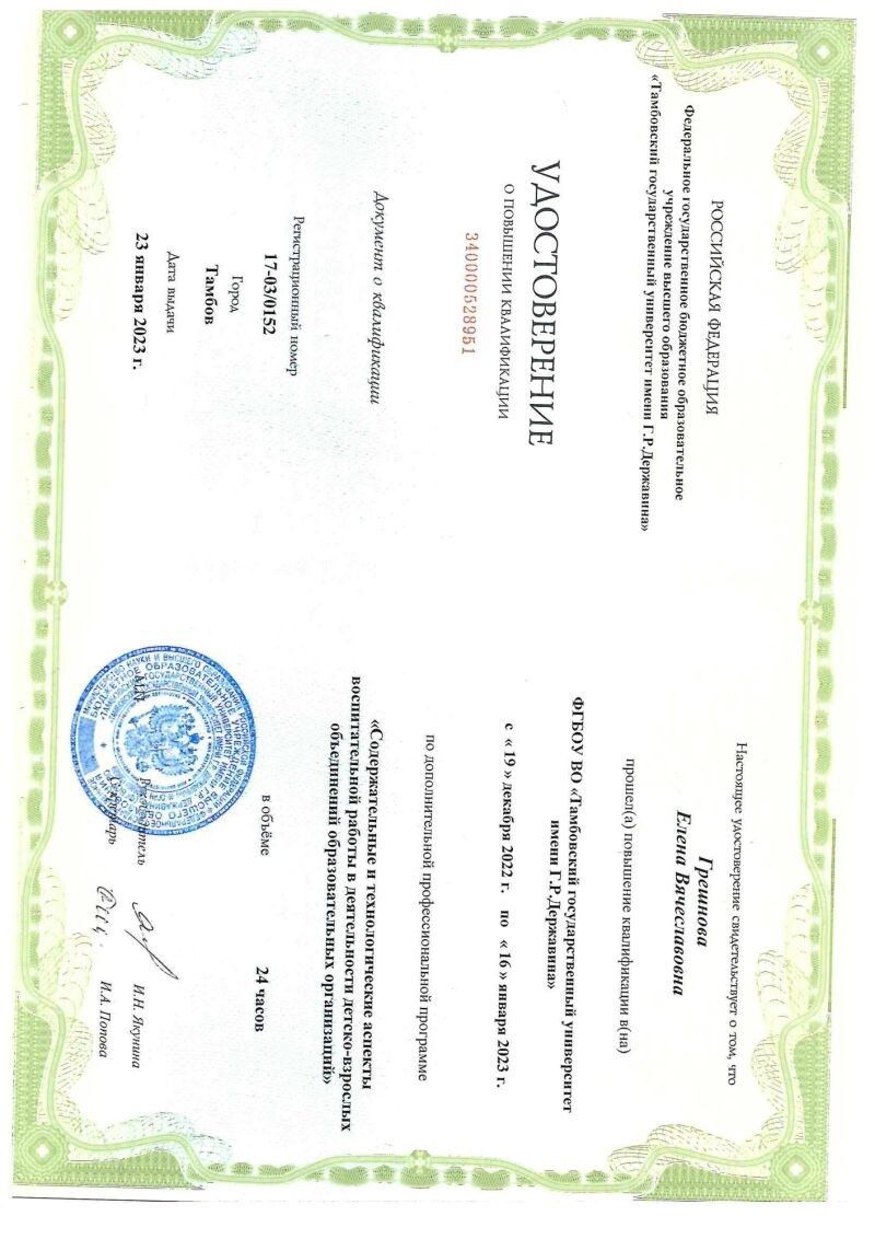 - ФГБОУ ВО «Тамбовский государственный университет им. Г.Р. Державина», обучение по программе «Содержательные и технологические аспекты воспитательной работы в детско-взрослых объединений образовательных организаций», 2022–2023 гг.