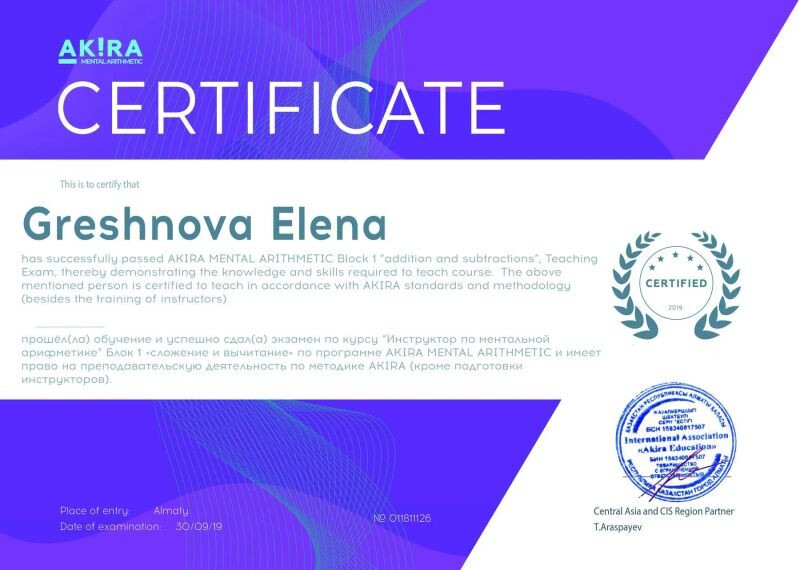 - Akira, курс «Инструктор по ментальной арифметике», 2019 г.