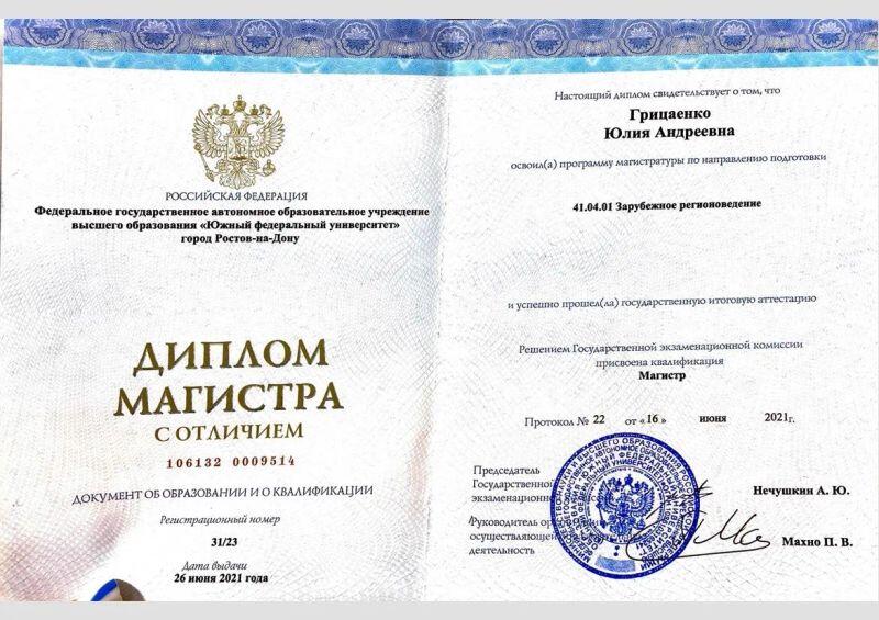 - Институт социологии и регионоведения южного федерального университета, направление – зарубежное регионоведение (турецкий как второй профильный язык), бакалавр, 2015–2019 гг.