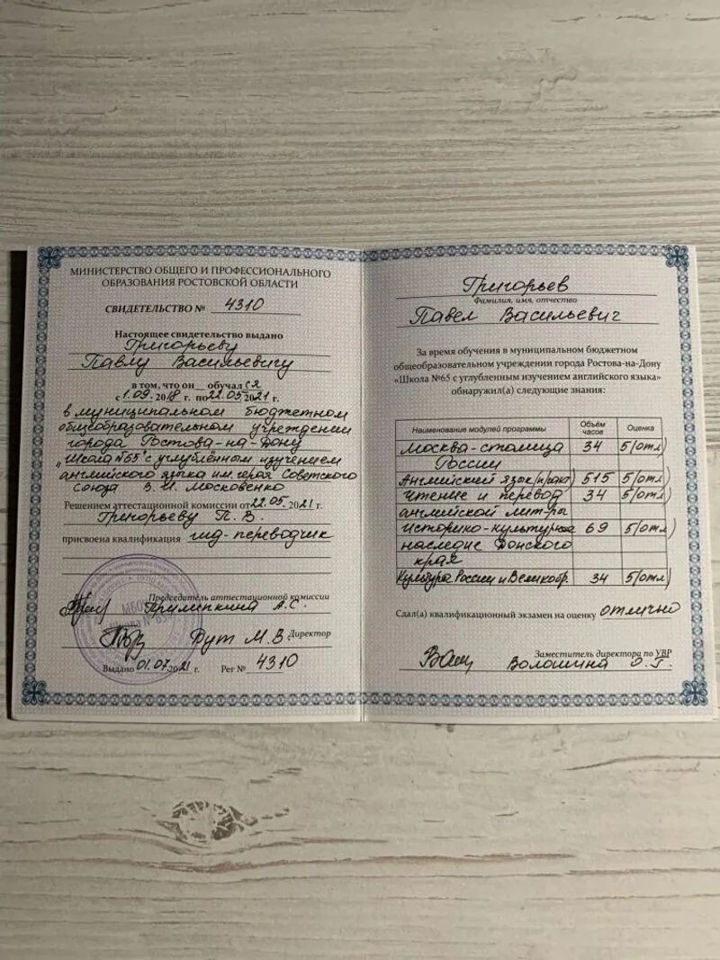 - МБОУ школа № 65, квалификация «Гид-переводчик», 2021 г.