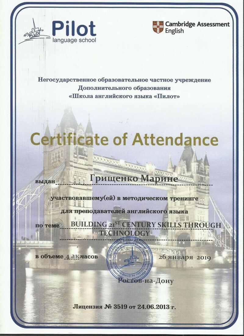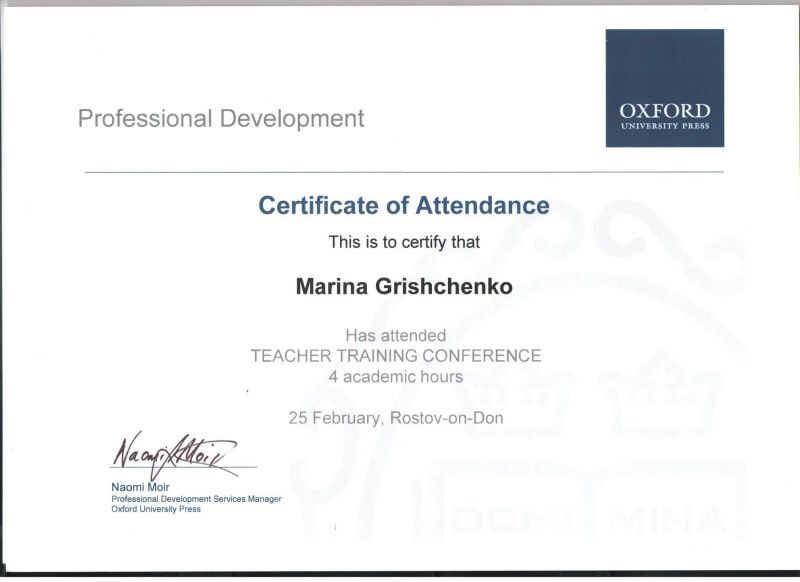 - Прохождение методического тренинга для педагогов "Формирование языковых навыков используя технологии 21 века" (с 2013 г.).