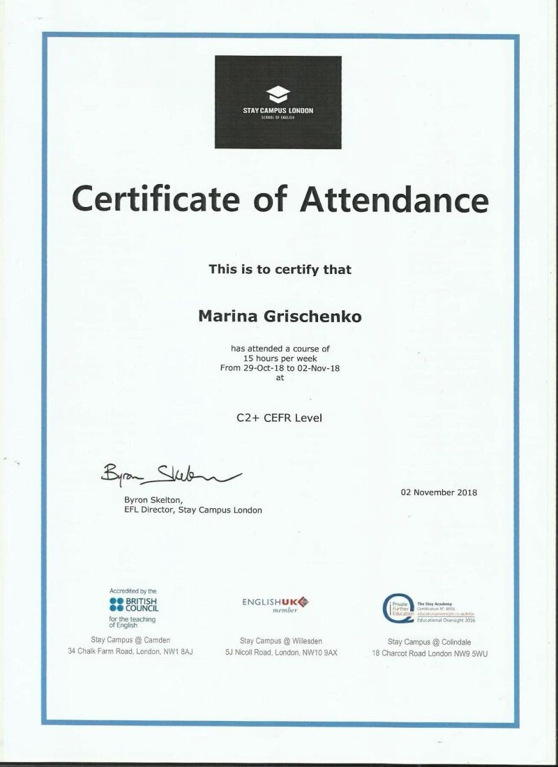 - Повышение квалификации в Лондоне (с 2018 г.).