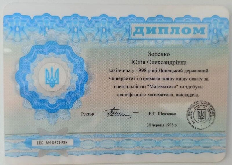 - Донецкий государственный университет, математик, преподаватель, 1993–1998 гг.