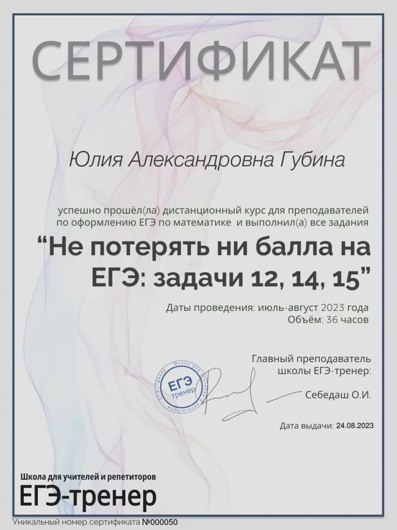- Курсы повышения квалификации по оформлению 12, 14 и 15 задания профильного ЕГЭ по математике (с 2023 г.).