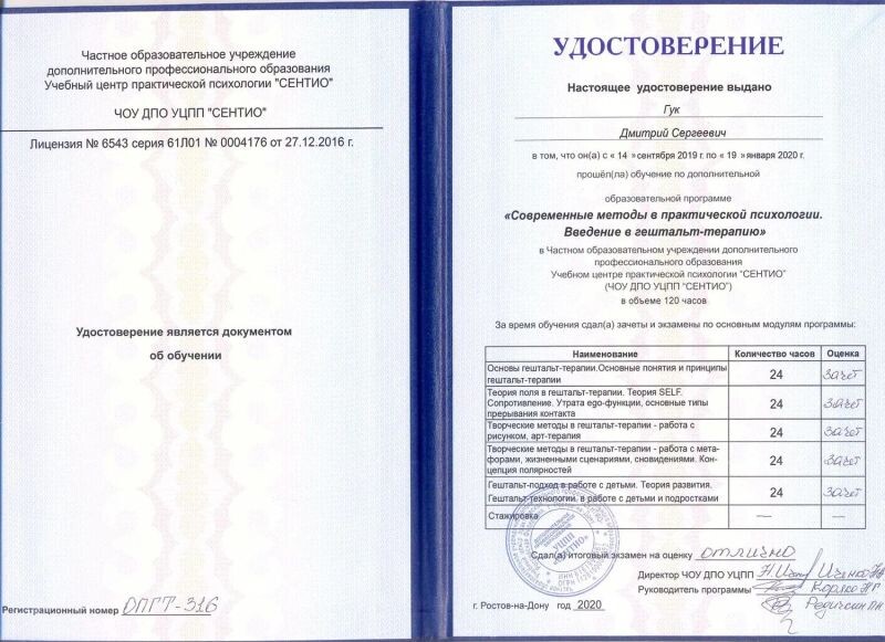 - ЧОУ ДПО УЦПП «СЕНТИО», программа «Современные методы в практической психологии. Введение в гештальт-терапию», 2019–2020 гг.