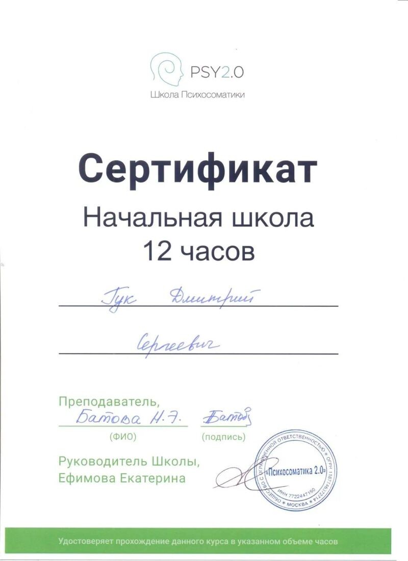 - Школа Психосоматики PSY2.0, Курс «Начальная школа», 2019 г.