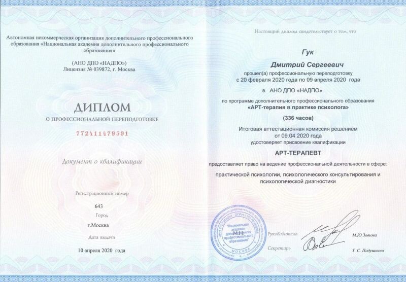 - АНО ДПО «НАДПО», АРТ-терапия в практике психолога, арт-терапевт, 2020 г.