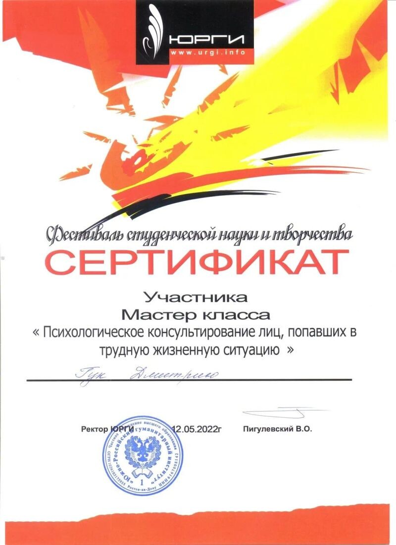 - ЮРГИ, мастер-класс «Психологическое консультирование лиц, попавших в трудную жизненную ситуацию», 2022 г.
