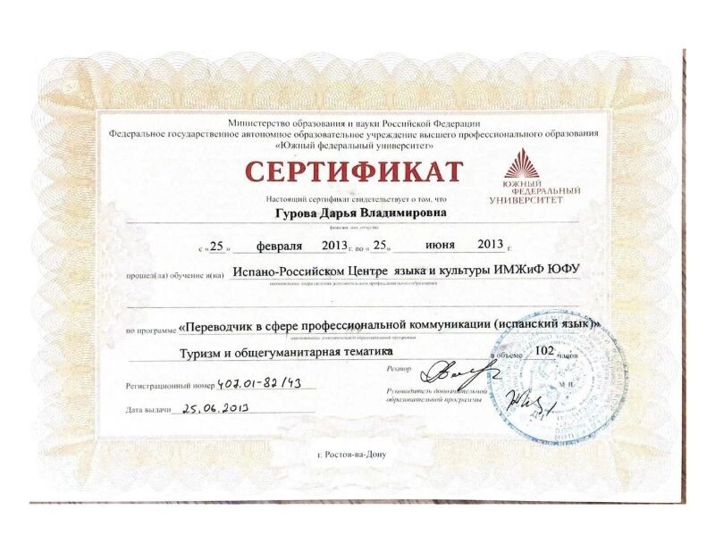 - ЮФУ, программа ДПО «Переводчик в сфере профессиональной коммуникации (испанский язык). Туризм и общегуманитарная тематика», 2013 г.