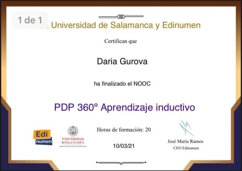 - 1 de 1 Universidad de Salamanca y Edinumen, методический курс — PDP 360° Aprendizaje inductivo, 2021 г.