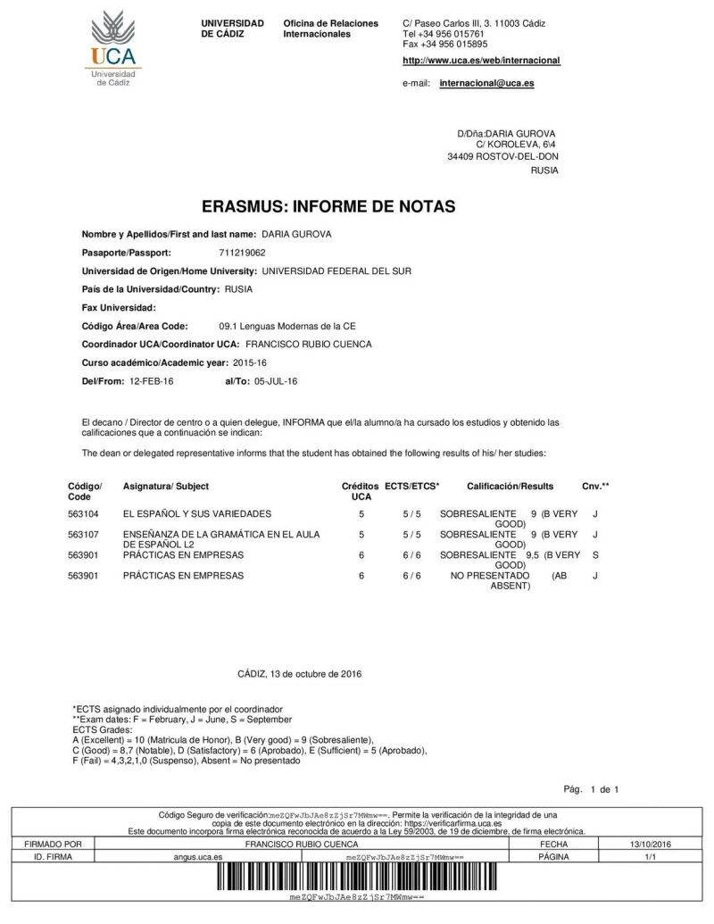 - Universidad de Cadiz, Facultad de Letras, магистратура по программе Erasmus, 2016 г.