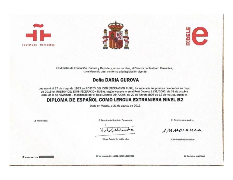 - Institute Cervantes, международный экзамен по испанскому DELE (B2), 2015 г.