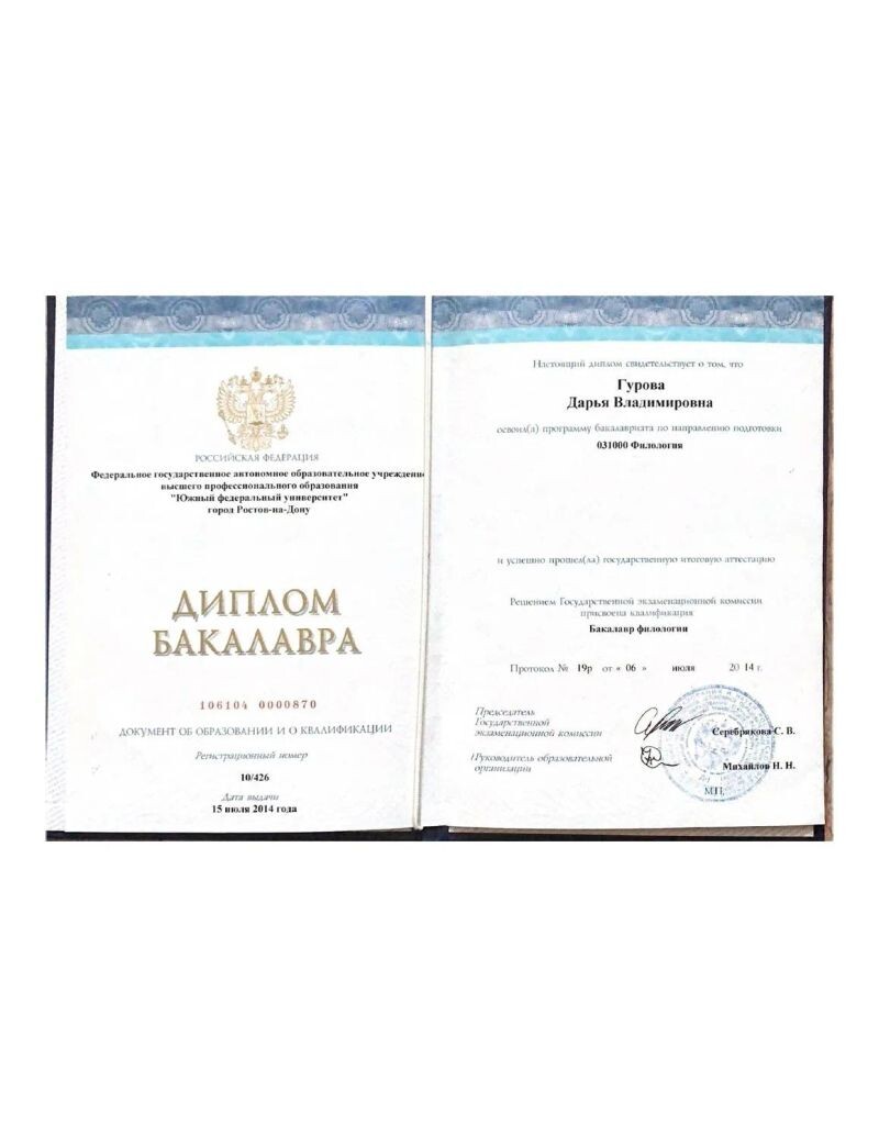 - ЮФУ, филология, квалификация — бакалавр филологии, 2010–2014 гг.