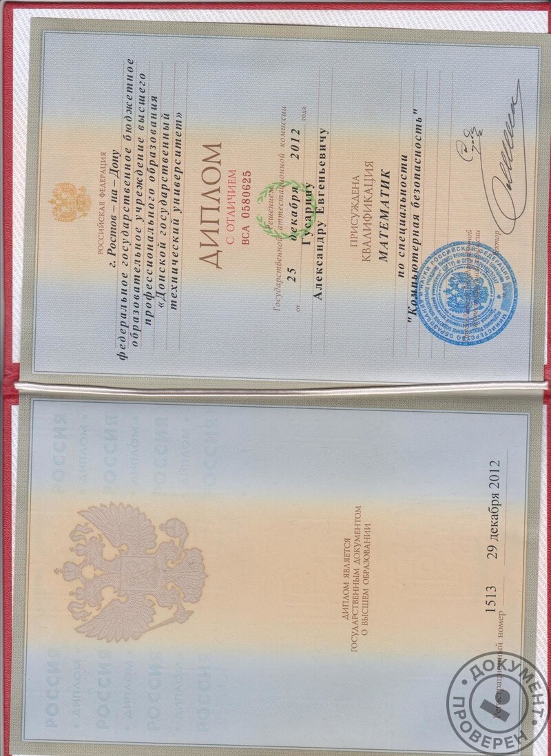 - Донской государственный технический университет, факультет информатики и компьютерной техники, специальность – компьютерная безопасность (2013 г.).