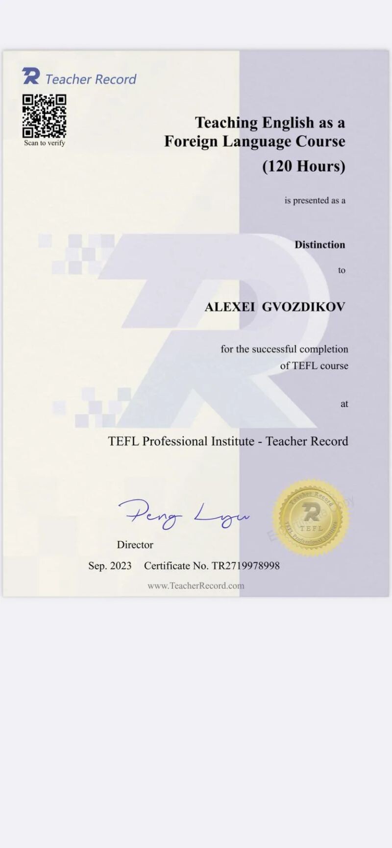 - TEFL Course Certificate (с 2023 г.).