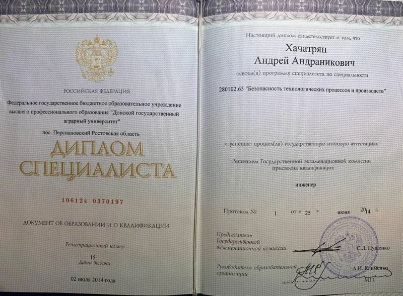 - Федеральное государственное бюджетное образовательное учреждение высшего профессионального образования «Донской государственный аграрный университет», безопасность технологических процессов и производств Инженер, 2009–2014 гг.