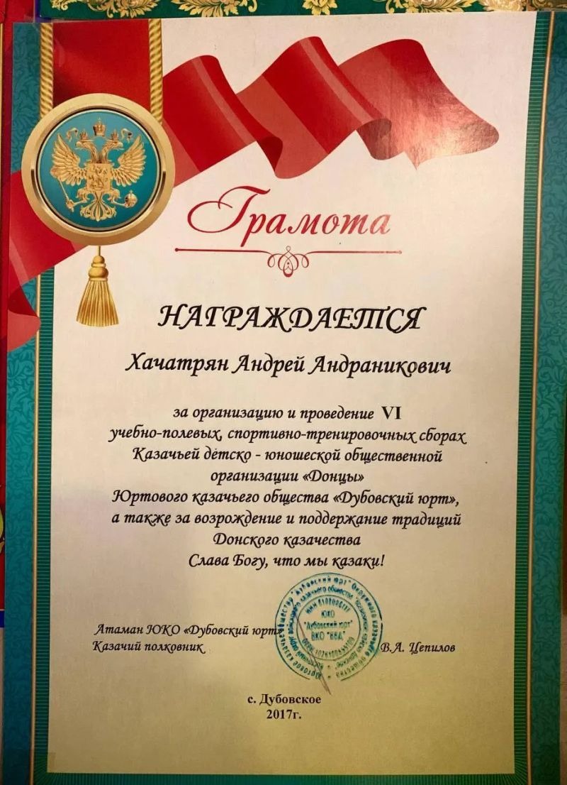 - ЮКО «Дубовский юрт», грамота за организацию и проведение VI учебно-полевых, спортивно-тренировочных сборов Казачьей детско-юношеской общественной организации «Донцы», 2017 г.