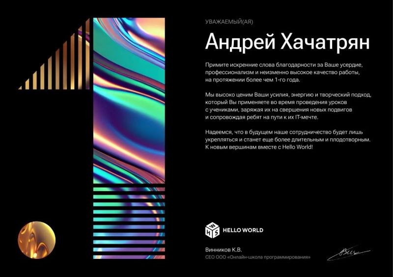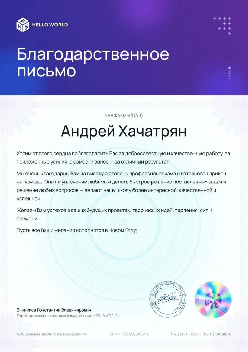 - Онлайн-школа программирования Hello World, благодарственное письмо за добросовестную и качественную работу, за приложенные усилия и за отличный результат, 2022 г.