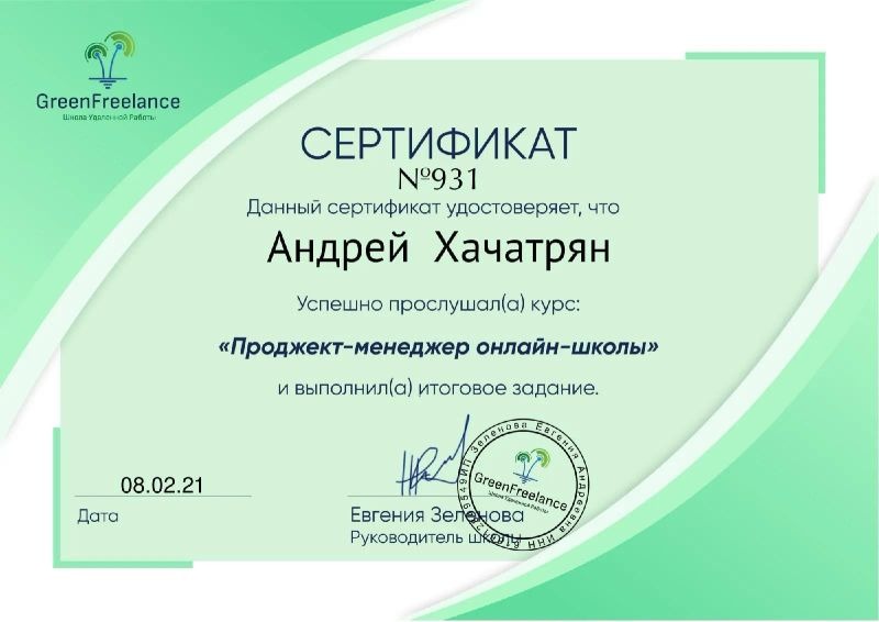 - Школа удаленной работы GreenFreelance, проджект-менеджер онлайн-школы, 2021 г.