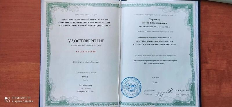 - ООО «Институт повышения квалификации и профессиональной подготовки», программа «Подготовка экспертов по проверке экзаменационных работ ЕГЭ по английскому языку», 2022 г.