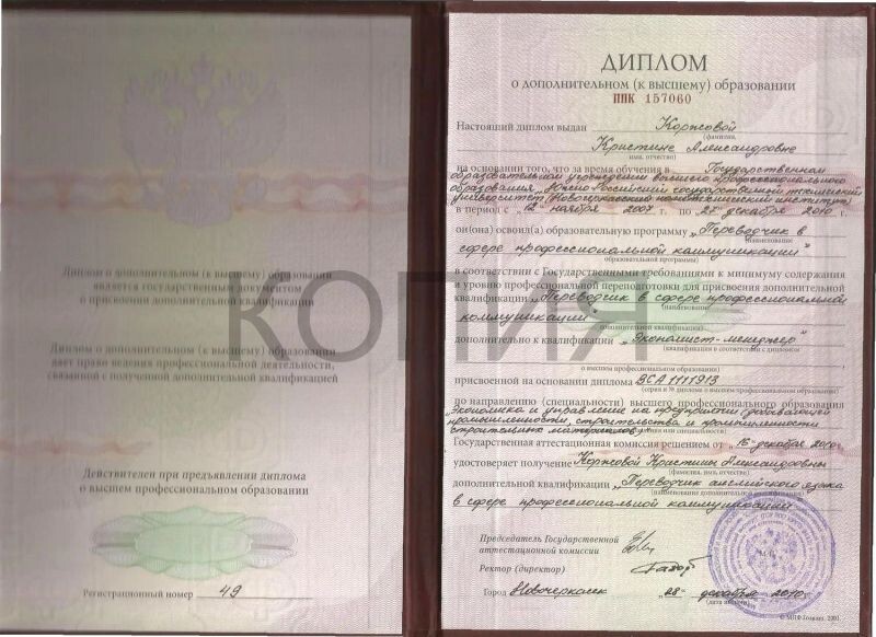 - ЮРГТУ (НПИ), дополнительное (к высшему) образование, переводчик в сфере профессиональной коммуникации, 2007–2010 гг.