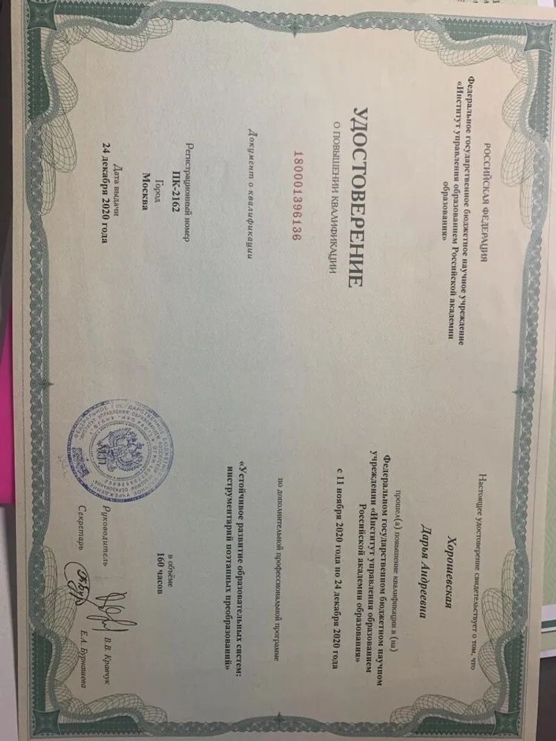 - Институт управления образование Российской академии образования, повышение квалификации по программе «Устойчивое развитие образовательных систем: инструментарий поэтапных преобразований», 2020 г.
