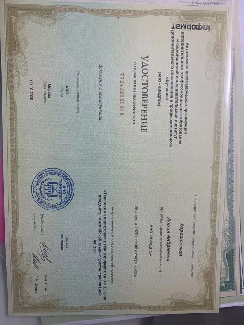 - Автономная некоммерческая организация дополнительного профессионального образования« Национальный исследовательский институт дополнительного образования и профессионального обучения» ,удостоверение о повышении квалификации, 2020 г.