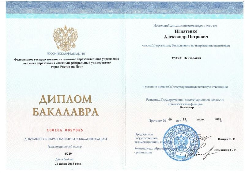 - Южный федеральный университет, Академия психологии и педагогики, факультет психологии, направление «Психология», бакалавр, 2011–2018 гг.
